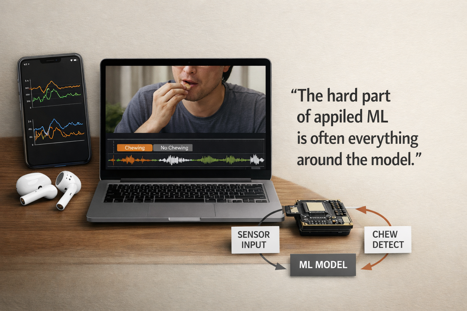 This article traces how ChewSense evolved from early experiments with raw AirPods motion signals into a structured pipeline for session collection, video-assisted labeling, feature extraction, model training, and on-device inference. The core lesson is that the hardest part of applied ML was not just training a model, but building the surrounding system needed to collect trustworthy data, preserve feature parity, and make runtime behavior believable.