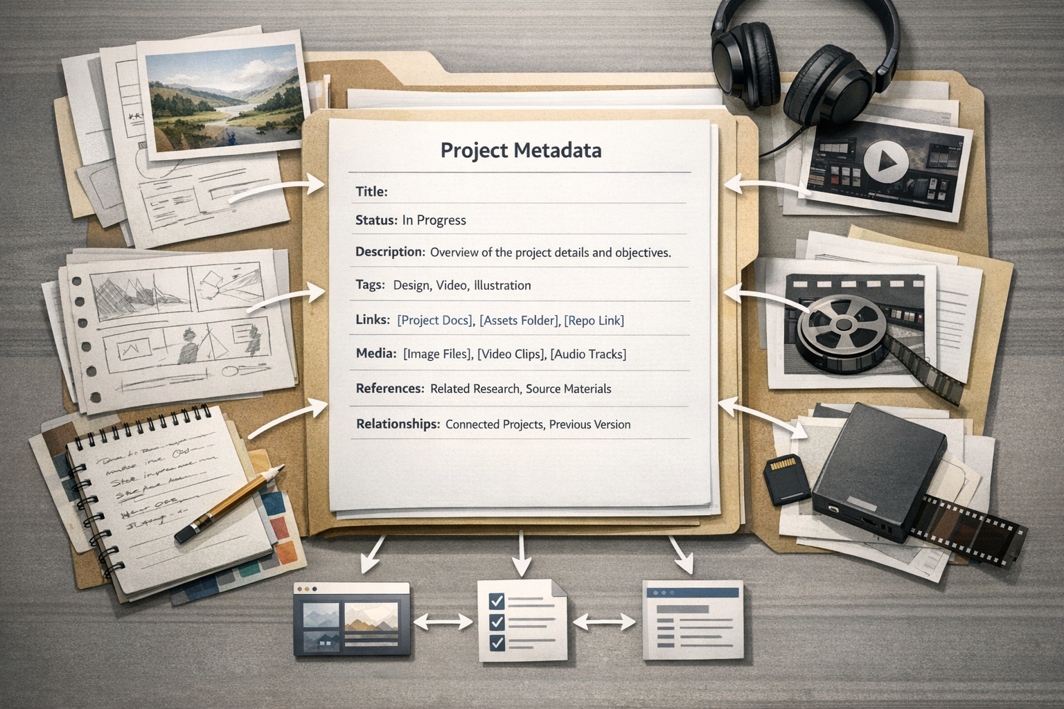 A serious project usually needs a title, yes, but also status, descriptions, media, references, relationships, context, and enough consistency that it can be reused elsewhere without re-entering everything manually.