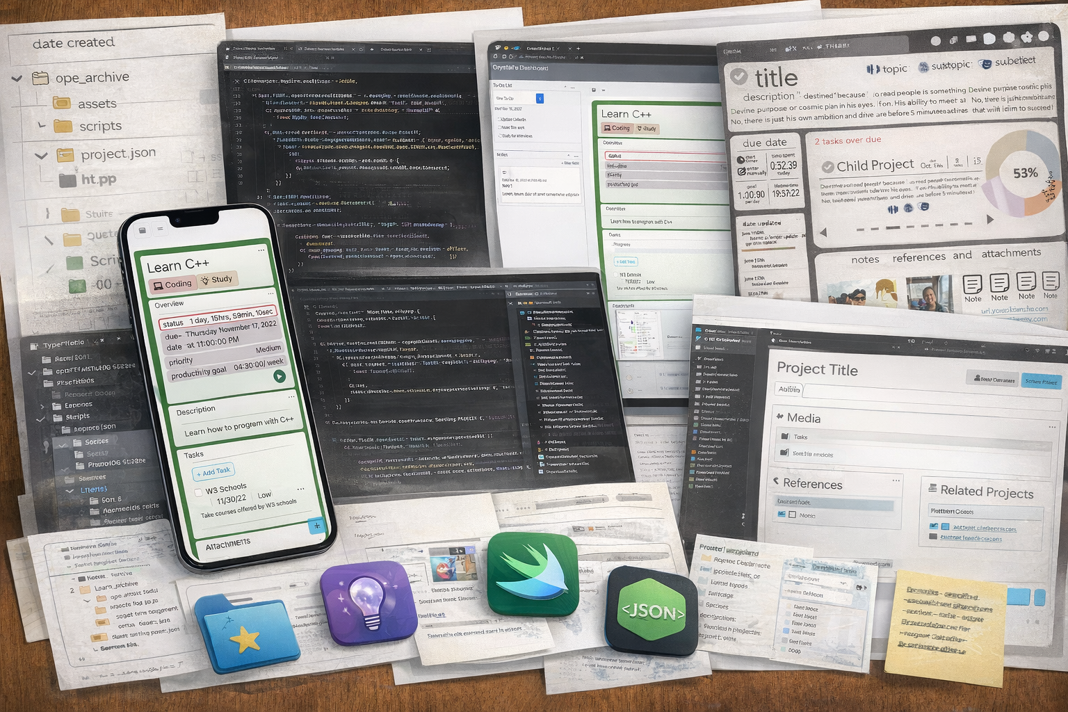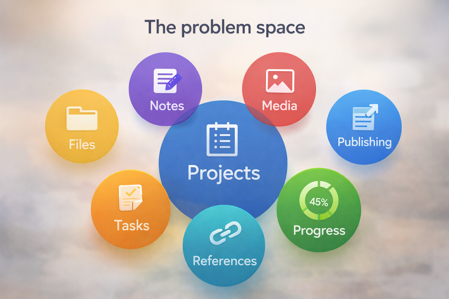 What made this version important is that it exposed the shape of the problem pretty quickly. I was not only trying to build a project manager. I was also trying to build a way for projects, ideas, notes, snapshots, and files to live close enough together that I would not lose context or have to keep translating the same information between systems.